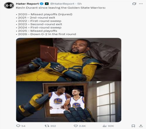 美媒Hater Report還曬出杜蘭特自2019年夏離開金州勇士隊(duì)(先簽后換去籃網(wǎng))的生涯: