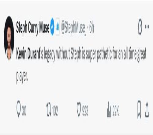 勇士媒體SCM:凱文-杜蘭特若沒有斯蒂芬·庫里,其輝煌生涯將會(huì)黯然失色,對(duì)于一位頂級(jí)球員來說,這是極其遺憾的。(此前庫里附加賽出局時(shí)也有庫里沒有杜蘭特的生涯也很黯淡的言論)