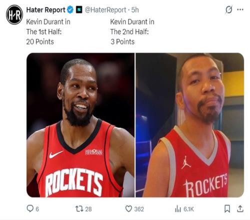 美媒Hater Report曬出杜蘭特上下半場(chǎng)的數(shù)據(jù),兩張對(duì)比圖其中下半場(chǎng)的是一位模仿KD的中國球迷。
