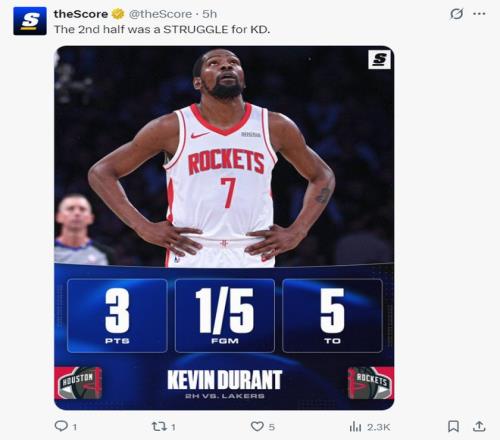 凱文-杜蘭特帶著膝傷在G2中復(fù)出,作為聯(lián)盟第一球癡,他在球隊(duì)危急存亡之秋復(fù)出是大概率事件,只可惜杜蘭特帶傷鏖戰(zhàn)卻未能幫助火箭拿下勝利,他全場(chǎng)比賽貢獻(xiàn)9次失誤更是引來多方的炮轟。