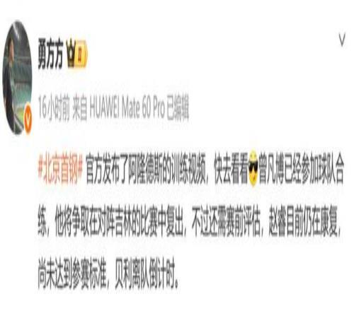 日前,京媒記者勇方方報道,曾凡博已經(jīng)參加球隊合練,他將會爭取在收官戰(zhàn)對陣吉林的比賽中復出,但趙睿目前仍在康復,尚未達到參賽標準。