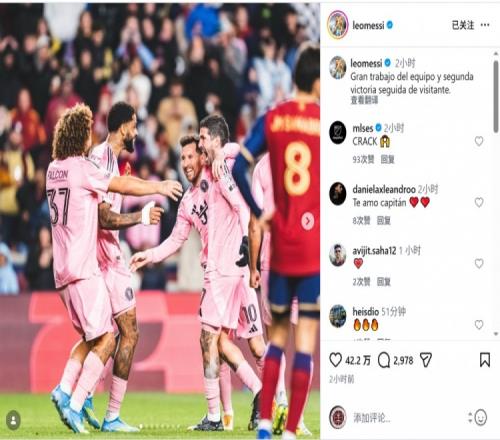 梅西社媒曬出與德保羅等隊友慶祝的照片,配文:“全隊表現(xiàn)出色,取得客場兩連勝。”
