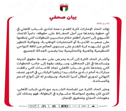“阿聯(lián)酋足協(xié)確認(rèn)將全力支持迪拜國民俱樂部采取任何措施以維護(hù)其合法權(quán)益,并呼吁亞足聯(lián)在組織俱樂部和國家隊賽事時,選擇合適的裁判團(tuán)隊。同時,阿聯(lián)酋足協(xié)強調(diào)亞足聯(lián)應(yīng)跟上世界足球在組織、技術(shù)和裁判等方面的進(jìn)步,確保公平公正。”