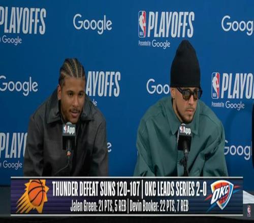 北京時間2026年4月23日凌晨,NBA季后賽西部首輪第二場,菲尼克斯太陽隊客場以107比120不敵俄克拉荷馬城雷霆隊,系列賽大比分0比2落后。比賽中太陽隊在判罰和防守執(zhí)行上遇到不少挑戰(zhàn),賽后,杰倫-格林與德文-布克一同出席媒體發(fā)布會。
