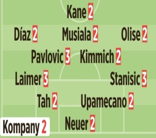 首發(fā):凱恩2分/迪亞斯2分、穆西亞拉2分、奧利塞2分/帕夫洛維奇3分、基米希2分/萊默爾3分、若納坦·塔2分、于帕梅卡諾2分、斯坦尼西奇3分/諾伊爾2分