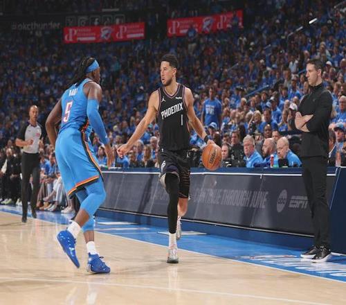 布克的問(wèn)題更微妙。23分的數(shù)據(jù)不差,但他在場(chǎng)時(shí)太陽(yáng)的進(jìn)攻并沒(méi)有"活"起來(lái)。17次出手,很多是強(qiáng)解——不是機(jī)會(huì)出來(lái)了,是時(shí)間快到了。這種打法在常規(guī)賽可以靠個(gè)人能力兜底,季后賽面對(duì)雷霆的協(xié)防體系,效率斷崖式下跌。