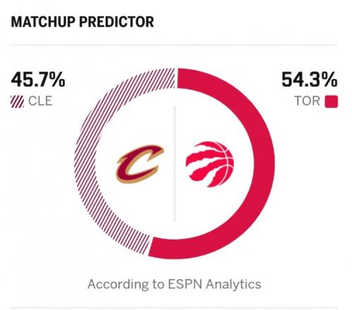 ESPN對(duì)本場(chǎng)比賽勝率進(jìn)行了預(yù)測(cè),騎士勝率為45.7%,猛龍則是54.3%。
