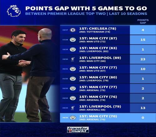 根據(jù)德國轉(zhuǎn)會市場的統(tǒng)計數(shù)據(jù),在最近10個賽季的英超比賽中,本賽季是在33場比賽過后前兩名球隊分差最小的一次,此前的最大分差曾達到23分。