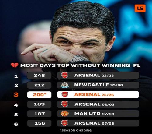 3.阿森納 25/26賽季 200天(聯(lián)賽進(jìn)行中)