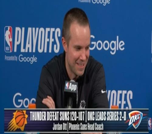 體育播報4月23日宣 NBA季后賽,太陽107-120不敵雷霆,大比分0-2落后,賽后太陽主帥喬丹·奧特接受了媒體采訪,以下為采訪全文。