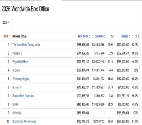 體育播報(bào)4月23日宣 據(jù)最新全球票房統(tǒng)計(jì),任天堂旗下動(dòng)畫電影《超級(jí)馬力歐銀河》大電影全球累計(jì)票房已達(dá) 7.52 億美元(約合人民幣 54.1 億元),正式超越《飛馳人生 3》的 6.41 億美元,登頂 2026 年全球票房冠軍。