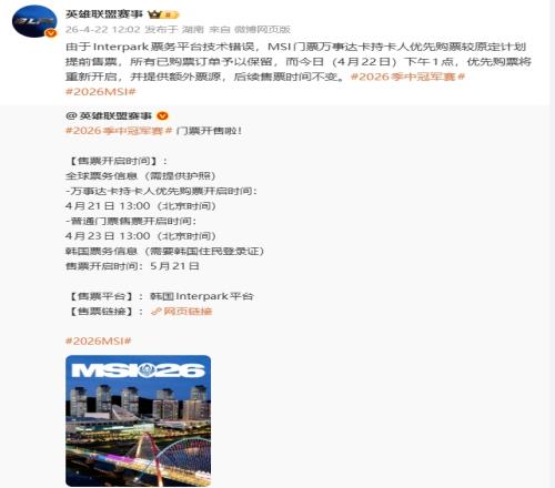 體育播報(bào)4月23日宣 MSI 2026韓國(guó)大田會(huì)展中心今日普通門票正式開售,但根據(jù)網(wǎng)友在評(píng)論區(qū)的反饋,疑似票務(wù)平臺(tái)再次出現(xiàn)故障,原定13點(diǎn)開啟售票通道但諸多網(wǎng)友都未能購(gòu)票。