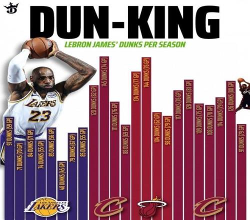 詹姆斯每個賽季扣籃次數(shù)一覽