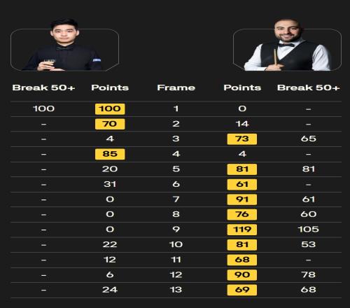 全場比賽侯賽因·瓦菲打出105分破百以及7桿50+,斯佳輝打出單桿100分,瓦菲次輪的對手將是特魯姆普。