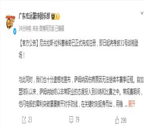 北京時間4月24日,廣東男籃官方發(fā)布公告,上賽季CBA得分王、本賽季隊內得分王小外援薩姆納因為傷病原因,無法繼續(xù)剩余比賽賽季報銷。廣東男籃已經給新外援拉科塞維奇完成正式注冊,他將身穿31號球衣征戰(zhàn)。