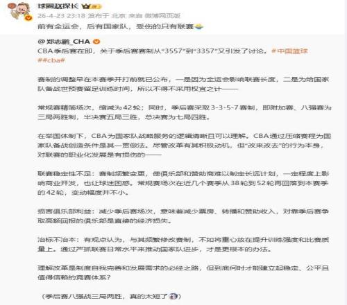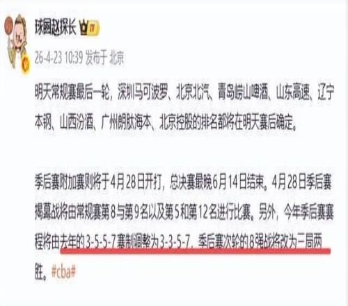 北時間4月24日消息,2026年CBA季后賽賽制再度調(diào)整,次輪(1/4決賽)由“五局三勝”壓縮為“三局兩勝”,整體賽程從“3-5-5-7”變?yōu)椤?-3-5-7”,附加賽將于4月28日開打,總決賽最晚6月14日落幕。這一變動引發(fā)球迷強烈質(zhì)疑:“常規(guī)賽冗長低質(zhì),季后賽卻草率縮水”,職業(yè)聯(lián)賽的穩(wěn)定性與競技尊嚴正被持續(xù)侵蝕。