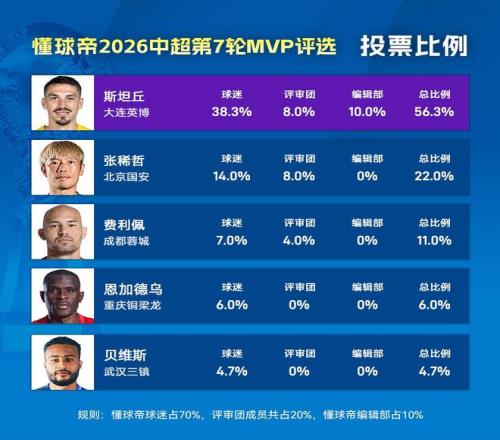 大家好,歡迎來(lái)到懂球帝2026賽季中超MVP的評(píng)選現(xiàn)場(chǎng)。大連英博中場(chǎng)斯坦丘憑借與遼寧鐵人的精彩世界波和全場(chǎng)表現(xiàn),以56.3%的得票率成功當(dāng)選!