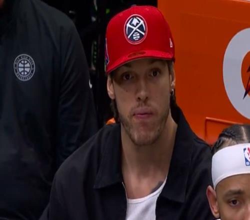 今天戈登因傷休戰(zhàn),帶著棒球帽坐在場(chǎng)邊觀賽,掘金損失重大。