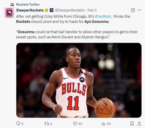 實際上在2月5日時,火箭隊因為沒能交易得到科比-懷特,火箭隊曾與公牛隊探索交易得到多森姆,因為多森姆是一個出色的控球手,他可以很好的減壓杜蘭特與申京。