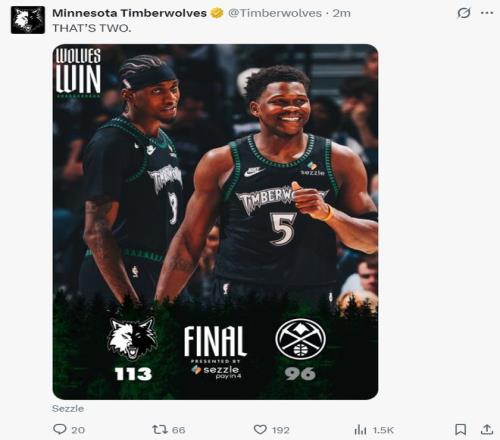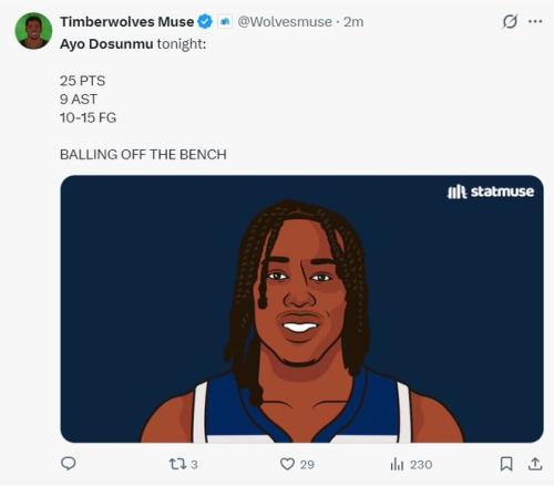 北京時間4月24日,森林狼113-96大勝掘金,大比分2-1反超。這場比賽森林狼一開場就壓制掘金,森林狼一度領(lǐng)先27分之多。約基奇再一次被戈貝爾防到哭,在愛德華茲因為膝傷進入更衣室后替補席的多森姆挺身而出成為球隊的第一核心,最終多森姆拿到森林狼最高的25分。