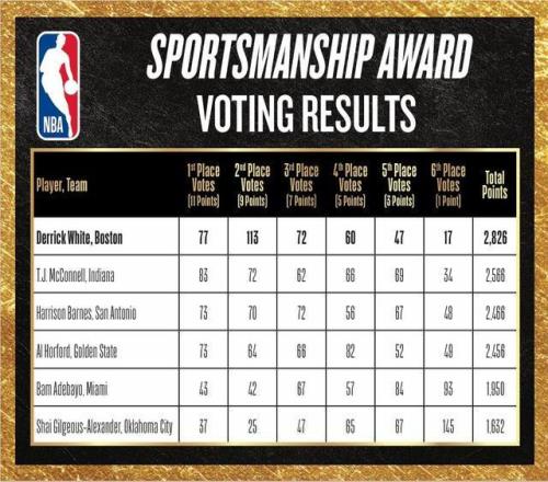 每支NBA球隊都會提名一名球員參與2025-26賽季體育道德風尚獎的評選。在30支球隊的提名人中,聯(lián)盟高管組成的評審團選出了6名最終候選人(每個分區(qū)各1人),隨后由現(xiàn)役NBA球員投票,從這6人中選出最終獲獎者。完整投票結(jié)果如下: