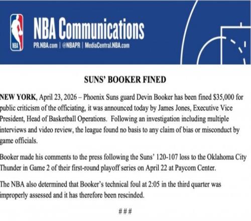 北京時(shí)間4月24日,NBA官方公布最新罰單,太陽(yáng)核心布克因?yàn)楣_(kāi)批評(píng)裁判被罰35000美元,但他給第三節(jié)的技術(shù)犯規(guī)被取消,而狄龍與多爾特第三節(jié)的技術(shù)犯規(guī)也均取消。除此之外,NBA官方表示,經(jīng)調(diào)查未找到雷霆與太陽(yáng)之間裁判存在偏袒或犯錯(cuò)的證據(jù)。