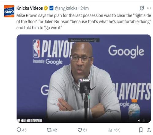 尼克斯主帥邁克-布朗更是透露:球隊(duì)絕殺的戰(zhàn)術(shù)就是為杰倫-布倫森畫的,因?yàn)椴紓惿矚g從右側(cè)去進(jìn)攻,我們就為他量身定制了這個(gè)戰(zhàn)術(shù),而且我告訴他努力去得分吧。(看起來布倫森成為最大罪人)
