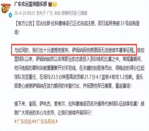 北京時(shí)間4月24日消息,CBA外援更換截止日,廣東宏遠(yuǎn)官方宣布:正式取消薩姆納的注冊,這位賽季場均貢獻(xiàn)21.7分、4.1籃板、4.0助攻的得分利器,就此告別本賽季的季后賽征程。