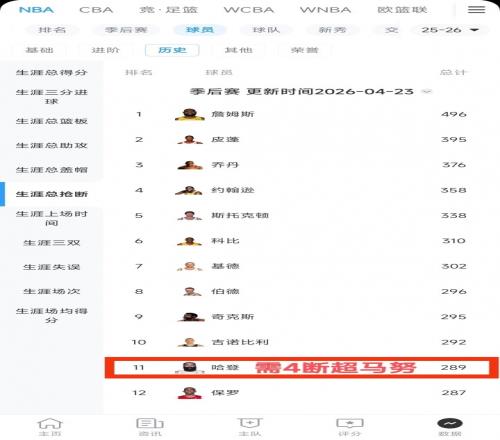 還需4搶斷,即可超越吉諾比利,升至季后賽歷史搶斷榜第10位