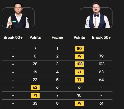 肖恩·墨菲打出單桿79、103、63、64分,先下五局拉開領先優(yōu)勢,隨后肖國棟連扳兩局,將比分追到2-5,第八局墨菲單桿50+再下一局,目前6-2領先肖國棟結束第一階段。