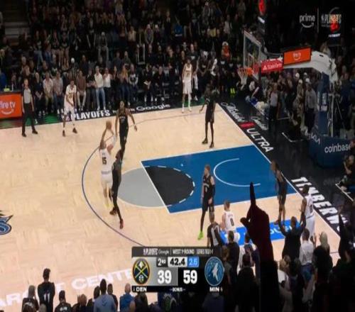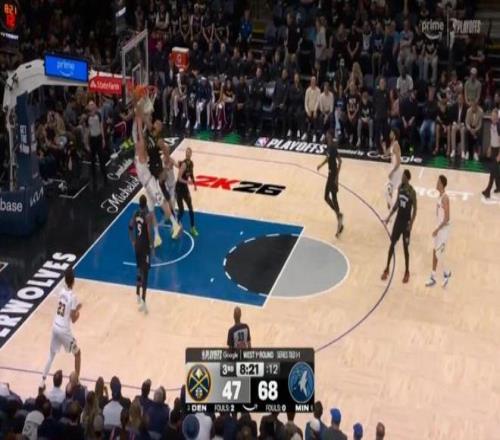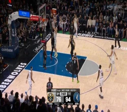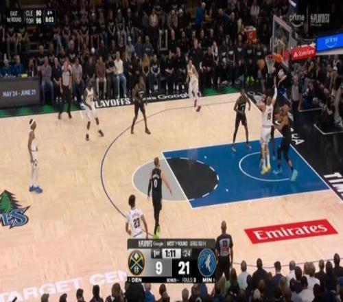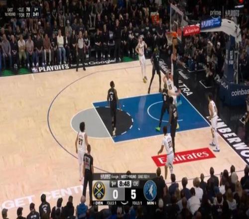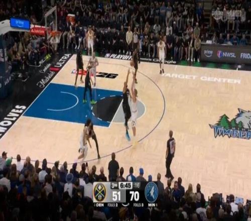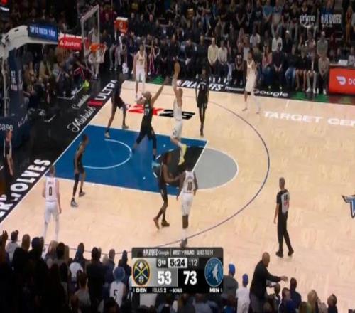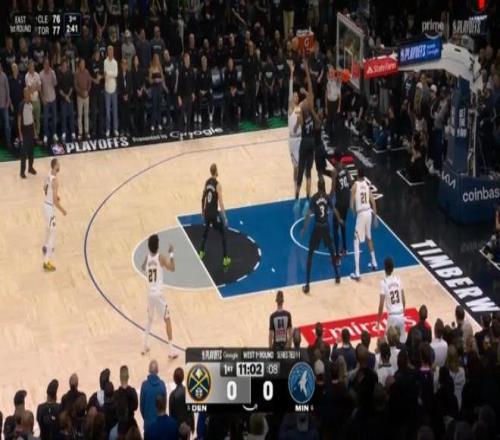 ——開局沒多久的一次進攻,約基奇錯位打愛德華茲,戈貝爾協(xié)防,被干擾的約基奇拋投出手都向后了,打鐵偏出