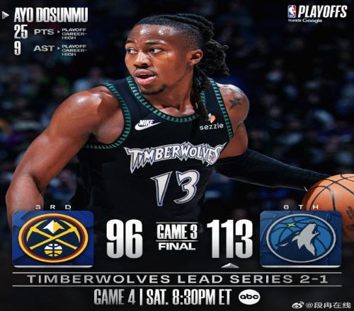 體育播報(bào)4月24日宣 NBA季后賽首輪,森林狼主場113比96擊敗掘金,大比分2比1領(lǐng)先。賽后籃球解說員段冉在社媒上點(diǎn)評了這場對決。