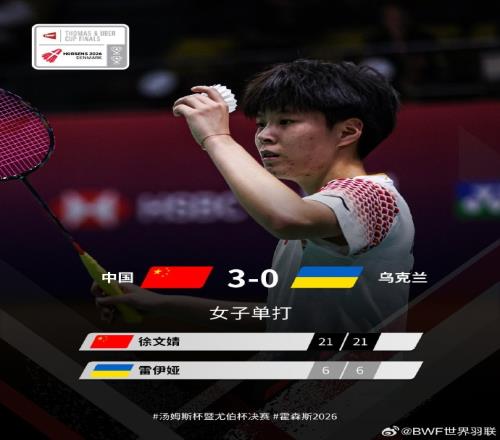 體育播報(bào)4月24日宣 2026年湯尤杯小組賽,尤伯杯國羽首戰(zhàn)對陣烏克蘭,徐文婧2-0(21-6、21-6)戰(zhàn)勝雷伊婭,中國隊(duì)大比分3-0領(lǐng)先烏克蘭,已經(jīng)提前鎖定本場揭幕戰(zhàn)勝利。根據(jù)小組賽規(guī)則,比賽將繼續(xù)進(jìn)行打滿5場。