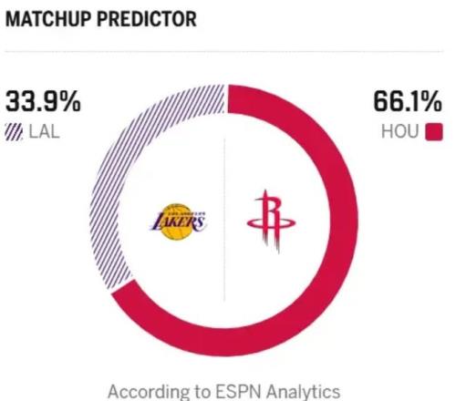 賽前,ESPN的數(shù)據(jù)模型預(yù)測(cè),火箭贏球概率高達(dá)66.1%,湖人贏球概率只有33.9%!