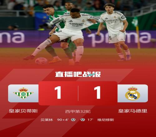 下半場(chǎng)補(bǔ)時(shí)3分鐘。最終全場(chǎng)比賽結(jié)束,皇家貝蒂斯1-1皇家馬德里。