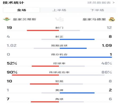貝蒂斯11皇馬全場數(shù)據(jù):射門1912,射正48,控球率52%48%