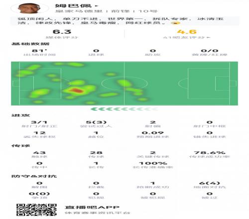 姆巴佩數(shù)據(jù):3射1正進(jìn)球被吹+傷退,3過(guò)人2關(guān)鍵傳球,評(píng)分僅6.3