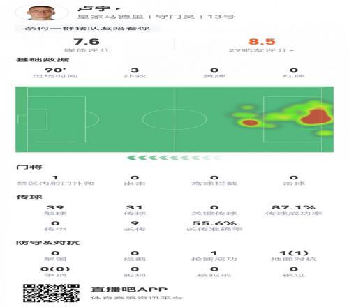 盧寧數(shù)據(jù):3次撲救,高接低擋屢獻(xiàn)神撲,評分7.6并列全隊(duì)最高
