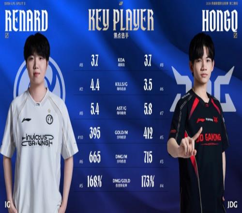 體育播報4月24日宣 LPL第二賽段IG對陣JDG,賽前官方發(fā)布了中單HongQ和Renard數(shù)據(jù)對比,具體如下: