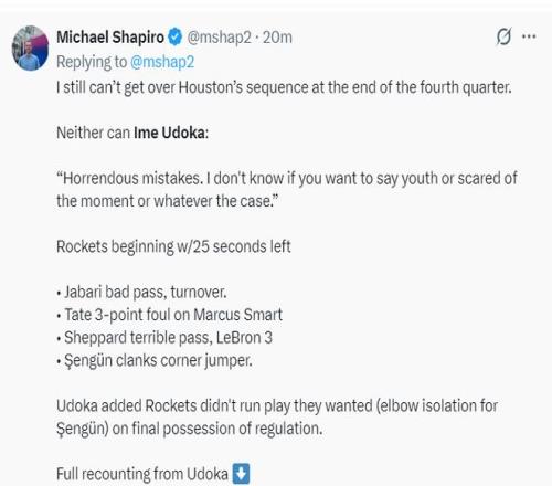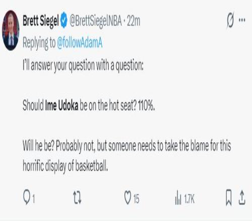 NBA記者Brett Siegel:烏度卡應該被解雇嗎?我覺得100%應該。但球隊會這樣做嗎?我覺得或許不會,但總得有人為此擔責,畢竟這是一場極其糟糕的了籃球表演。