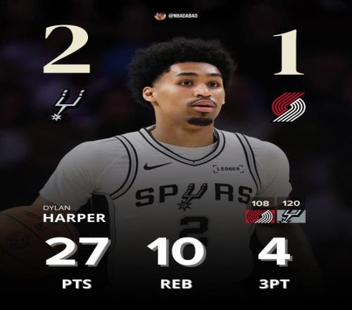 北京時(shí)間4月25日,波特蘭開拓者主場108比120不敵圣安東尼奧馬刺,系列賽1比2落后。此役馬刺球星文班亞馬缺陣,但新秀迪倫·哈珀下半場爆發(fā),帶領(lǐng)馬刺完成15分逆轉(zhuǎn),贏得勝利。中國球員楊瀚森在比賽失去懸念的最后時(shí)刻登場,拿到一個(gè)后場籃板球。