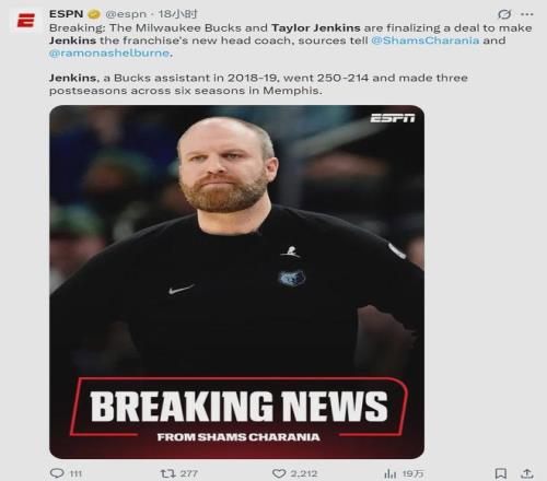 據(jù)ESPN名記Shams報(bào)道,雄鹿和泰勒-詹金斯敲定合同,詹金斯正式接替里弗斯,成為雄鹿新任主教練。雄鹿老板和管理層本周前往孟菲斯,和詹金斯進(jìn)行了兩次面談。雄鹿老板認(rèn)為,詹金斯擅長培養(yǎng)年輕球員,能夠塑造球隊(duì)文化!
