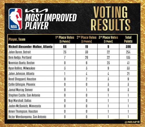 這里也有你文班亞馬收獲1張最快進(jìn)步獎(jiǎng)第三選票排名榜單第10