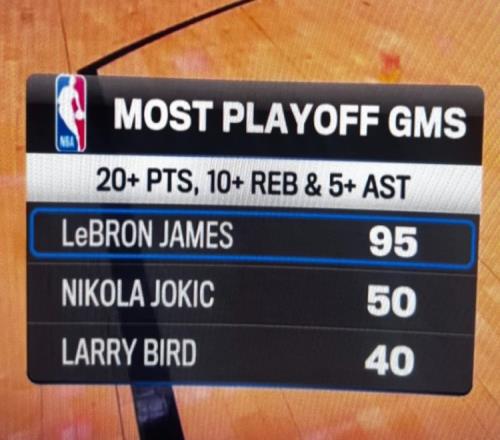 據(jù)統(tǒng)計(jì),這是詹姆斯季后賽生涯第95次單場至少20分10籃板5助攻,繼續(xù)刷新自己的紀(jì)錄,排在第二的是約基奇的50次。