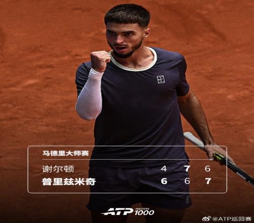 體育播報4月24日宣 ATP1000馬德里大師賽第二輪,4號種子謝爾頓爆冷不敵資格賽球員普里茲米奇,止步第二輪。