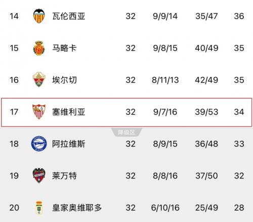 值得一提的是,上賽季塞維利亞最終以1分優(yōu)勢(shì)保級(jí),最終排名第17,與目前的積分排名一致。