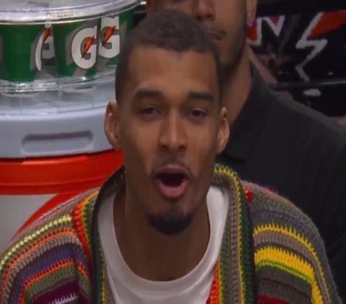 本場(chǎng)比賽文班亞馬作壁上觀,比賽中他坐在場(chǎng)邊,對(duì)著開(kāi)拓者球員喊話:“你們本應(yīng)該0-4落后?!?/p>