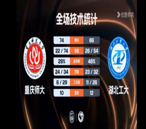 末節(jié)比賽,胡琳易和羅子昂對(duì)飆三分,重慶師大奮力反擊一度將分差迫近到個(gè)位數(shù),黃浩杰得分助攻一肩挑,幫助球隊(duì)保持兩位數(shù)的領(lǐng)先,重慶師大連續(xù)造成殺傷通過罰球努力追趕,胡琳易三分殺死比賽。最終,湖北工大86-74擊敗重慶師大。