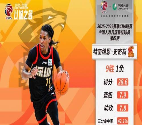 北京時間4月25日,CBA聯(lián)賽官方宣布,深圳新世紀(jì)獵豹籃球俱樂部球員特奎維恩-史密斯當(dāng)選2025-26賽季CBA四月最佳國際球員。
