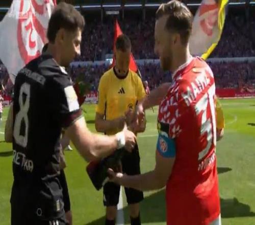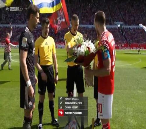 本場(chǎng)比賽開打前,美因茨隊(duì)長(zhǎng)西爾萬-威德默代表俱樂部向拜仁送了一束鮮花和一瓶香檳作為冠軍禮物。